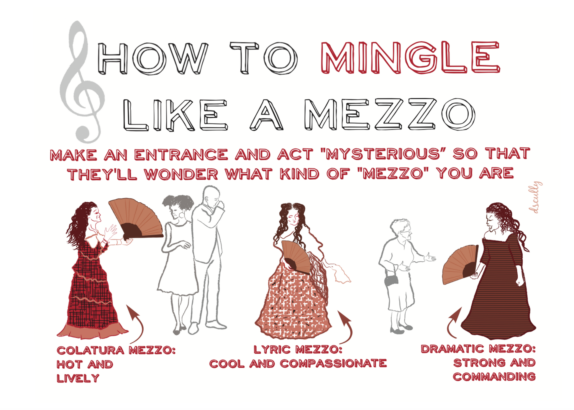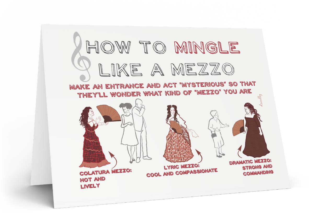 A guide mixing and mingling with range. This opera-themed greeting card offer tips on how to mingle like a mezzo.