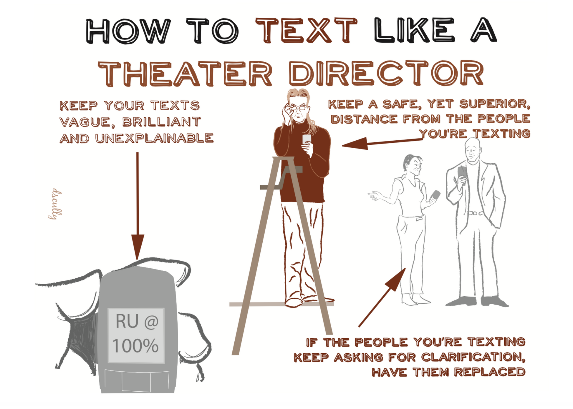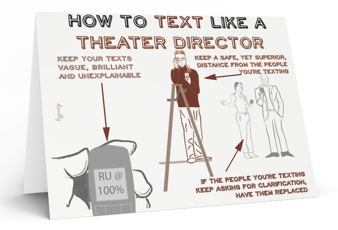 A guide to directing the drama in your life, all from the comfort of your phone. This theater-themed greeting card offer tips on how to text like a theater director.