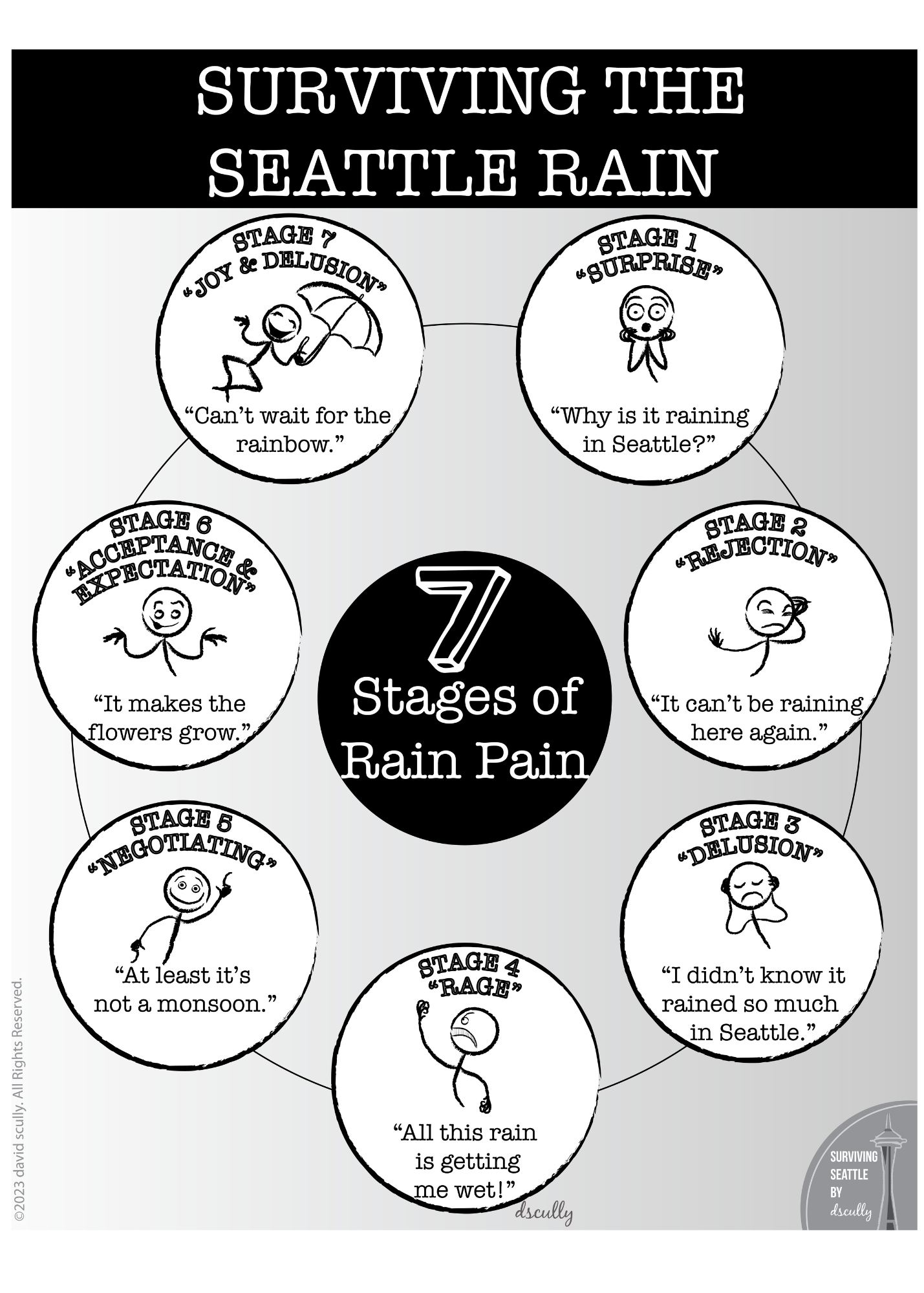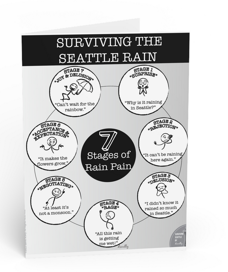 Which stage are you at in the 7 stages of Seattle Rain Pain? Are you in acceptance or delusional mode, or a bit of both? This card will shed light on the drizzle.